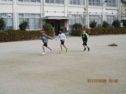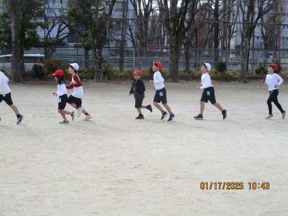 走る時にどんな工夫をしたのか聞くと、「お化けのポーズで(手の力をぬいて)走ったら楽。」「〇〇さんが言ってたみたいに心の中で1,2って言いながら走ると長く走れた。」などの意見が出ていました。