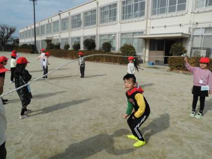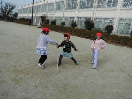 子ども達が元気に大縄跳びで遊んでいます。体育?いえいえ音楽の学習です。