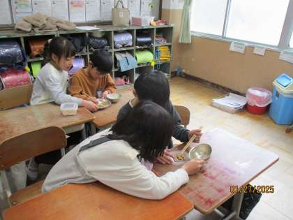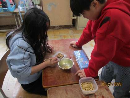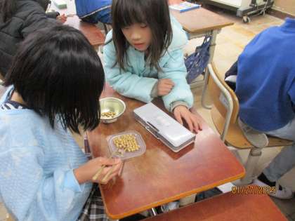 今週は給食週間です。みんなで豆つまみしました。3分間でどれだけつまめるか、子どもたちはとても意欲的に取り組んでいました。大盛り上がりでした。