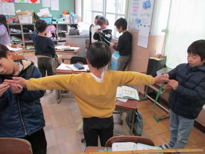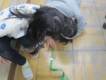 手を広げた長さを測りました。紙テープを使って、手を広げた長さを測り、床にテープを置いて、100センチものさしを使い、目盛りを読み取りました。協力してすすめました。