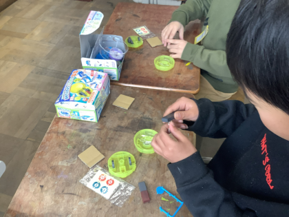 くっつけたり、磁石とクリップの間に段ボール紙を挟んだりして実験しました。楽しみながら磁石の性質を知ることができました。
