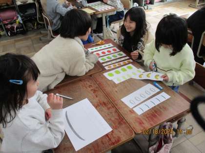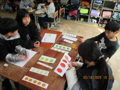 「トマトを2つください。」「はいどうぞ。」「ありがとう」等のやりとりを英語で言いました。オリジナルサラダが出来上がってきました。