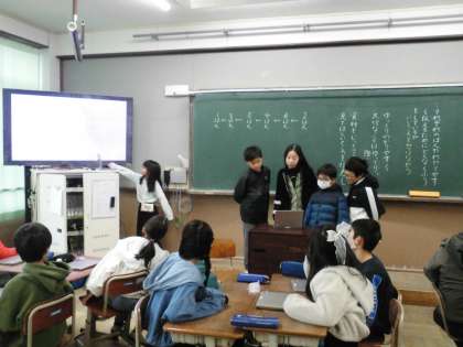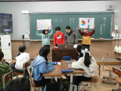 国語では、普段の生活でみんながどのようにしているのか、気になるテーマをグループで決め、調査して発表しました。自分たちで調査したアンケート結果を示しながら、上手に発表していました。