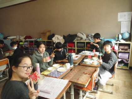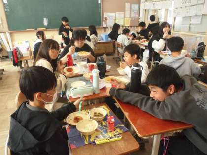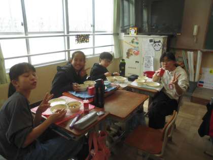 今日の給食は「とんかつ」です。卒業をお祝いしての豪華なメニューに大喜びでした。