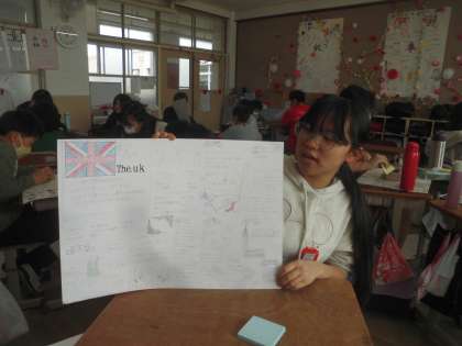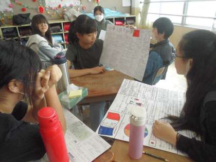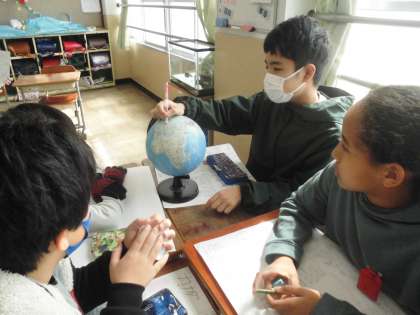 「世界の国に目をむけよう」」の学習で自分が調べた国についてグループでプレゼンテーションをしました。地球儀で調べた国の位置を説明していますね。新聞を見せながら説明したり、工夫して伝えていました。