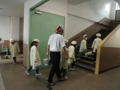3年生は先生と一緒に運んでいました。今日のメニューは何かな?楽しみですね。