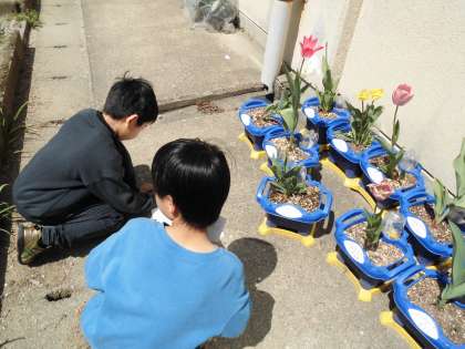 観察でメモしたことをもとにして、花びらの数や葉っぱの形、大きさを意識してノートにチューリップをかきました。