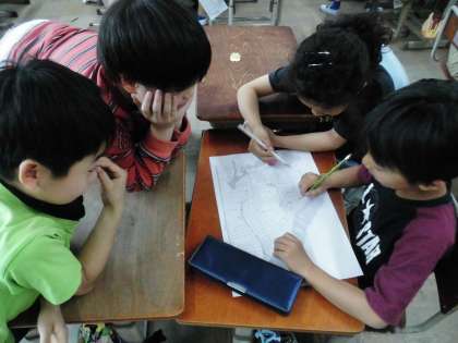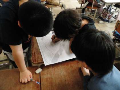 学校のまわりにはどんな施設や建物があるのか、グループで話し合いながら地図に書き込みました。実際にどこに何があるのか、これから確かめていきたいと思います。