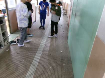 濡れた新聞紙をちぎってまいて,廊下を掃き掃除しています。誇りもたたないし,隅々まできれいになるし,さすがですね!