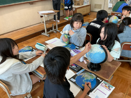 地球儀を使って、日本やほかの国の位置を調べました。