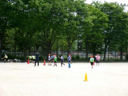 リレーのバトンパスの練習をしていますね。チームで繰り返し頑張っていました。