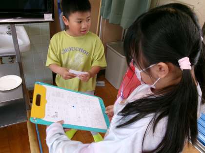 2年生が1年生に校舎の中を案内しています。優しく声をかけて説明をしていました。