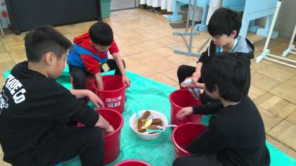 椅子にしっかりと座って、バケツの中の水を使って、ブラシに石鹸をつけて、とても上手に洗うことができています。