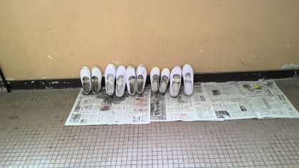 洗った上靴は、お休みの間に干して乾かします。今日は雨だったので、校舎内に干しました。みんなきれいに並べることができていますね!休み明けには、きれいになった上靴を履くのが楽しみですね。