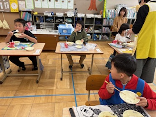 みんなで楽しみにしていた、カレーうどんの給食をおいしくいただきました!しっかり活動した後の給食は、とてもおいしかったです!