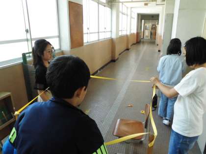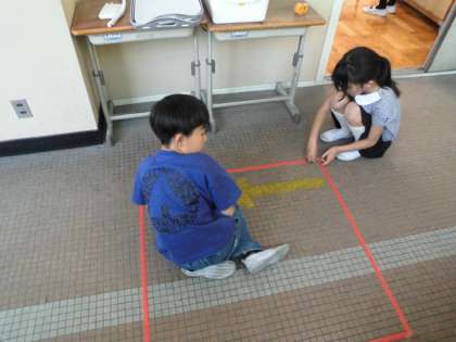 ずれないように、みんなで角をおさえて取り組んでいました。
