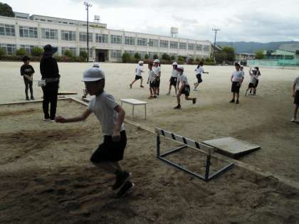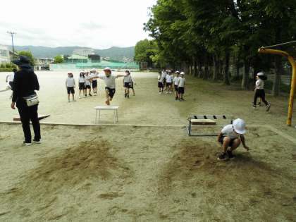 授業の最後には「うでをあげたら前よりとべた」「ふみきりでしっかりふみきるといい」とふりかえることができました。