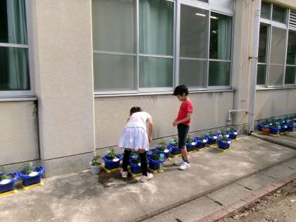 何の苗を植えたのかな?まだ小さい苗にそっと水やりをしています。大事に育ててね。