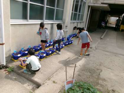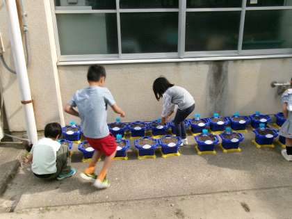 1年生が水やりをしていますね。いつ芽が出るのかな?楽しみですね。