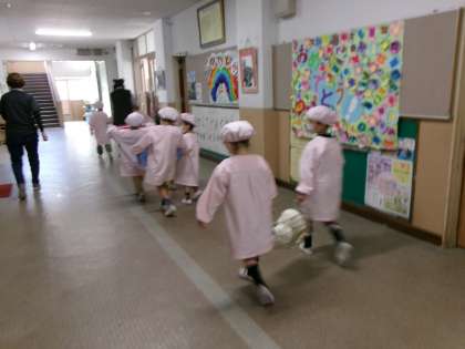 1年生が給食当番を頑張っています。みんなで協力して運んでいますね。今日もおいしく食べてね。