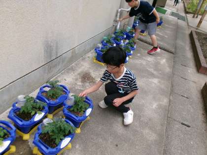 たいせつにお世話をしているトマトが小さな身を着けたと教えてくれました。赤くなるのが楽しみですね。