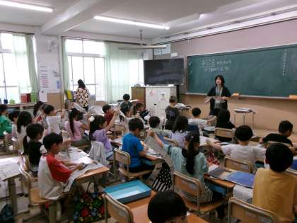 ここは1年生の教室です。先生と一緒委新聞紙をビリビリ〰!楽しそうですね。