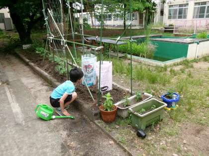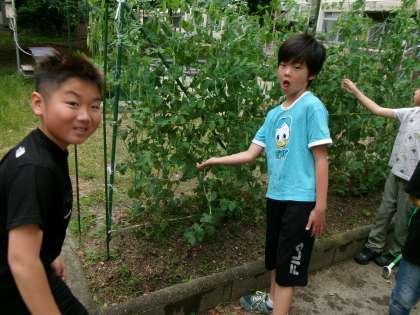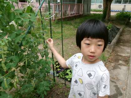 あおぞら学級の畑です。今日もみんなでお世話をしています。豆がどんどん大きくなってきています。いつ,食べられるかな?楽しみですね。