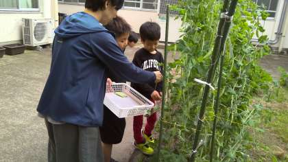あおぞらの畑のえんどう豆の実が、しっかりと大きく育ってきています。触ると、豆の大きさがよく感じ取れます。今日は、子どもたちがそれぞれ触って豆がしっかりと育っているものを収穫しました。野菜の名前のネームプレートを、子どもたちが、素敵なイラスト入りで作ってくれて、畑のそれぞれの場所に、差し込んだり、貼ったりしました。