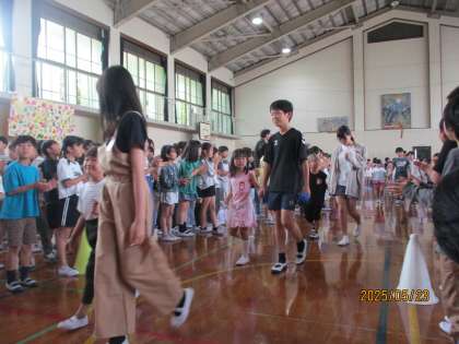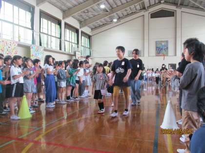 6年生に手をつないでもらい、2〜5年生の拍手のなか入場です。体育館の舞台の上にある特等席に着席しました。