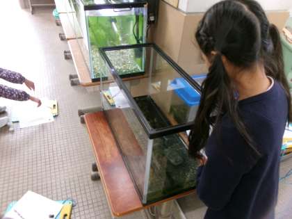 玄関の水槽にいる様々な生き物を熱心に観察しています。どうやら国語の学習で詳しく伝えるための文作りに必要なことをメモしているようです。頑張ってね。