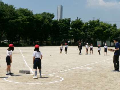 青空の下,ソフトボール投げに挑戦です。どこまで投げられるかな?