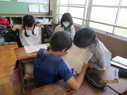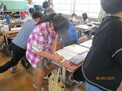 昨日の学習で、筆者の主張に共感できるか、納得できるか、疑問に思うかを自分の経験を踏まえて考えを書きましたが、今日は、それぞれの考えを交流しました。友だちのノートを見て、思ったことを付箋を書いて、「自分の経験を詳しく書けばもっとわかりやすいで。」「私も同じことあった。共感できる。」などと交流していました。