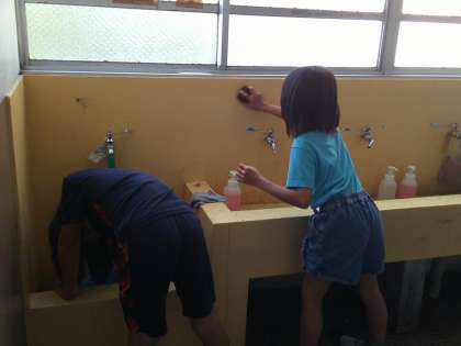 習字の後、汚れていた洗面所をたわしとスポンジで