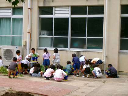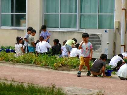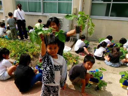 1年生が朝顔の苗を抜いていました。も〜っと大きく育てるために2本残して後はお家にもって帰るんだそうです。お家でも大切に育ててね。