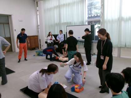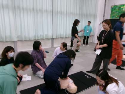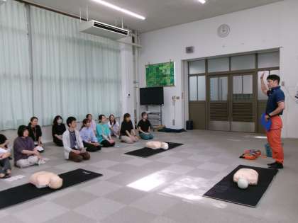 今日は子ども達の大切な命を守る為に教職員研修として,消防署の方に来ていただいて,救命講習会をしました。