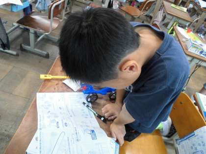理科では、風の強さによって車の動きがどう変わるのかを調べます。