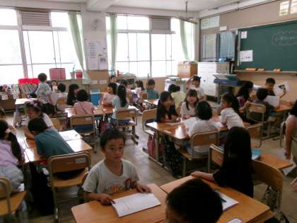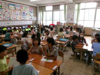 1年生が国語の学習で学んだことをいかして自分だけのクイズをつくりました。友達とクイズを出し合って,楽しく活動をしていました。