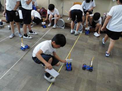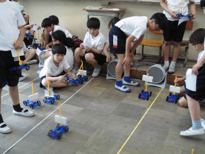 風の強さを変えると、車の動きがどうなるか実験しました。