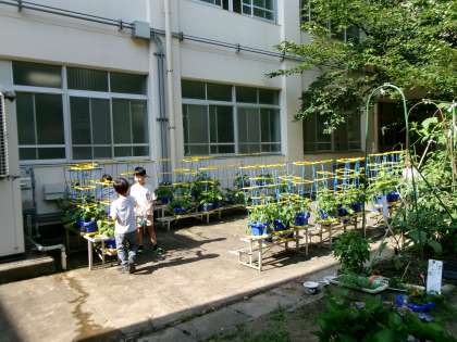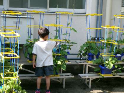 朝顔がどんどん大きくなっていますね。今日もせっせとお世話中!