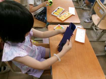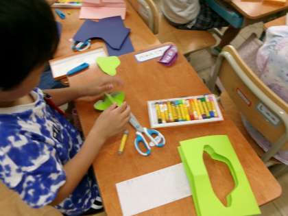 材料をじっくり見ながらイメージを膨らませている1年生。素敵な作品を作ってね。