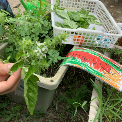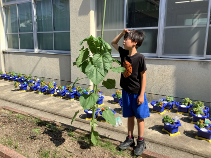 あおぞら学級の子どもたちは、毎日、あおぞら畑の野菜や花のお世話をがんばっています。お水やりや雑草取りの他に、観察をしています。ひまわりの高さを調べたり、花の様子をよく見たりしています。