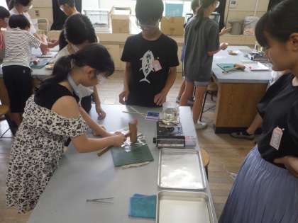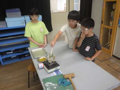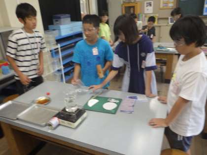 日光に当てた葉っぱと、日光を遮断した葉っぱを煮て、ろ紙に成分を写し取ってからヨウ素液に漬けました。