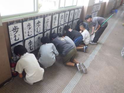 床を隅々までピカピカにしようと、暑い中みんなで頑張りました。