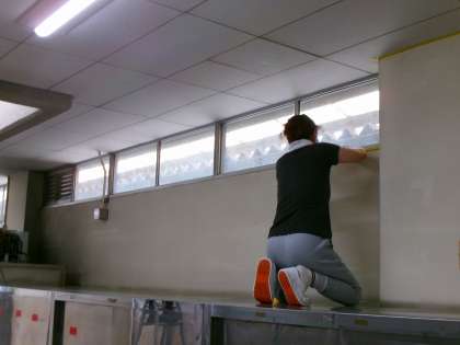 給食室で調理員さん,事務職員さんが作業をしてくださっています。2学期からきれいになった給食室でおいしい給食をいただくことができますね。暑い中での作業,ありがとうございます。