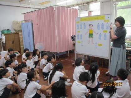身体計測(身長・体重)を実施しました。身体計測の前に、養護の菊地先生から、1日にどれぐらいの水を飲めばよいかのお話がありました。子どもたちの想像以上に汗やおしっこで体から水分が出ていることを知り、水分補給の大切さを学びました。