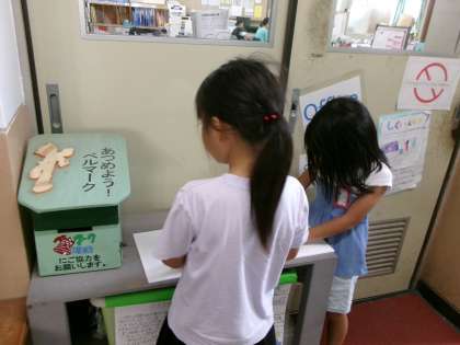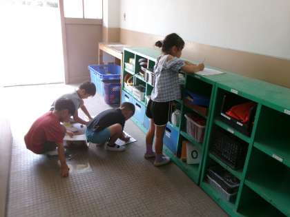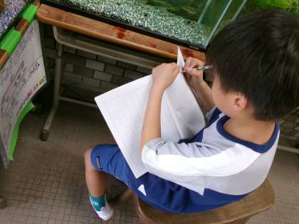 1年生が校舎内のあちこちをさがしまわっています。「何しているの?」「カタカナをみつけてるの」見つけたカタカナを一生懸命ノートに書いていました。