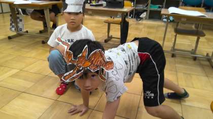桃山小学校の皆さんへの紹介メッセージ掲示物と、準備体操・「昆虫太極拳」のときに使う、昆虫のお面が完成しました!出来上がったら、実際に被ってみました。昆虫になった気持ちで体を動かしてみました。