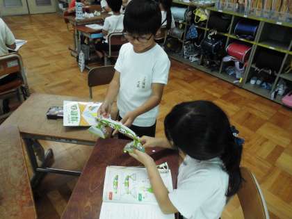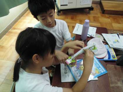 てんびんで比べるとどちらが重いかわかることを学習しました。