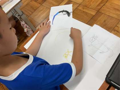 たくさんの生き物をデッサンしてから画用紙の中にお話をつくりました。