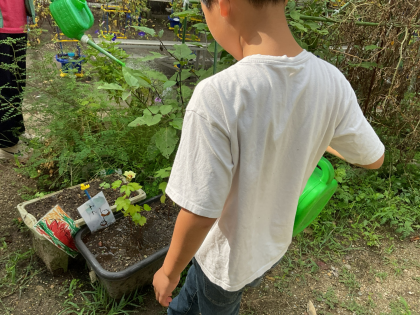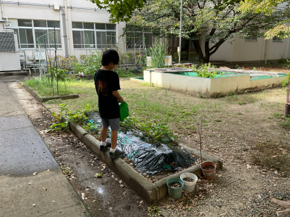 子どもたちが1学期から、毎朝、水やりや観察を続けてきたあおぞら畑。なすは季節が過ぎてきましたが、ピーマンは元気で実をつけてくれています。さつまいもが畑では元気にツルと葉を伸ばしています。